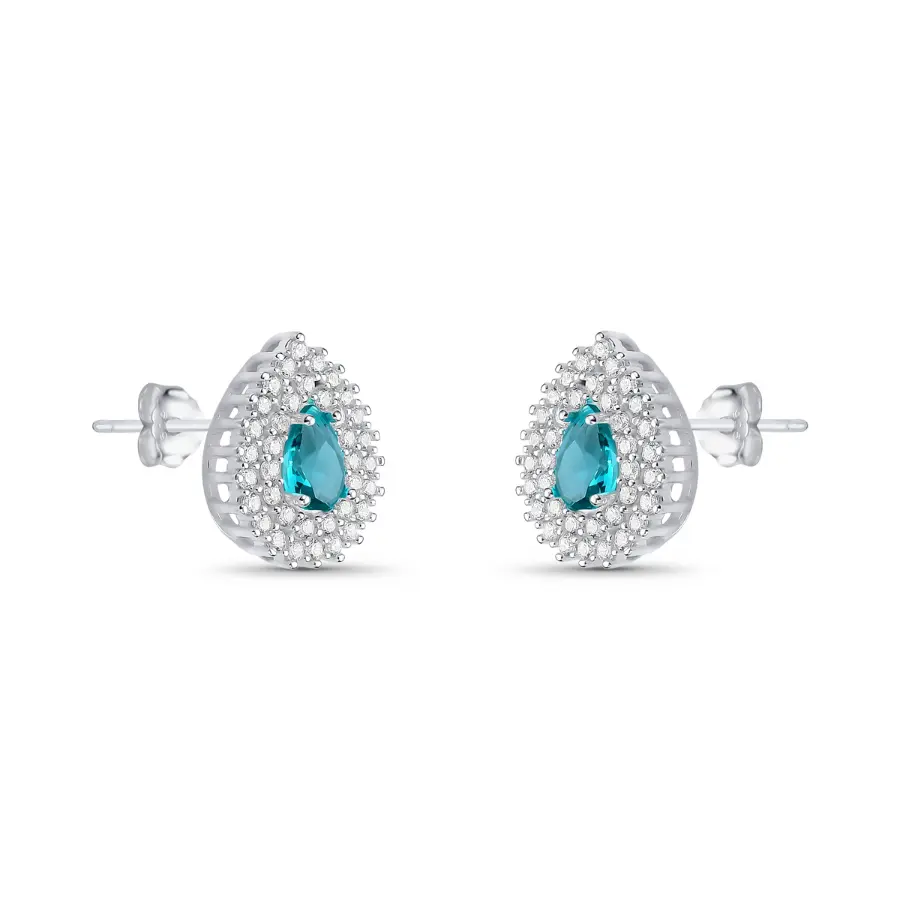 Brinco de Gota Cravejado com Zircônias Brancas cor Turmalina da Paraíba. \n \n<strong>Medida: Altura x Largura:</strong> 1,3cm x 1cm
